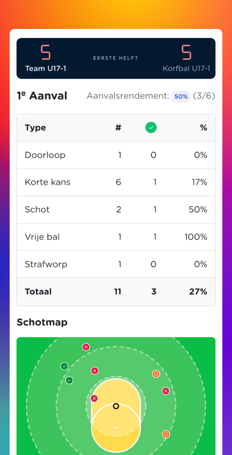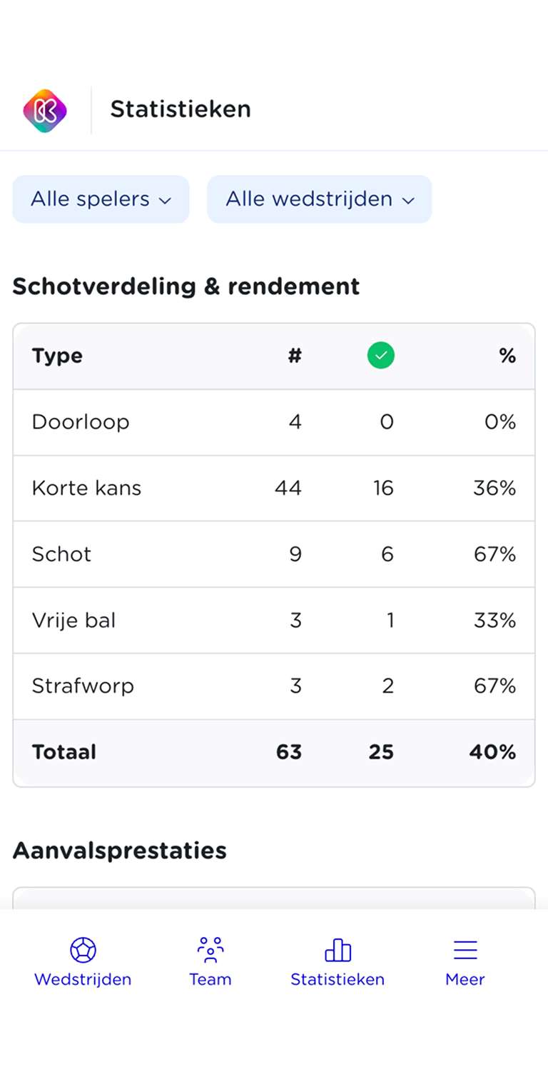 Na de wedstrijd blijft alle data beschikbaar en wordt deze omgezet in waardevolle inzichten. Je ziet niet alleen wat er is gebeurd, maar ook waarom. Ontdek van welke posities doelpogingen worden genomen, waar kansen ontstaan en welke keuzes het meeste rendement opleveren. Dit helpt om gerichter te trainen en beter te coachen. Je kijkt verder dan alleen raak of mis. Je krijgt inzicht in patronen, keuzes en effectiviteit.
